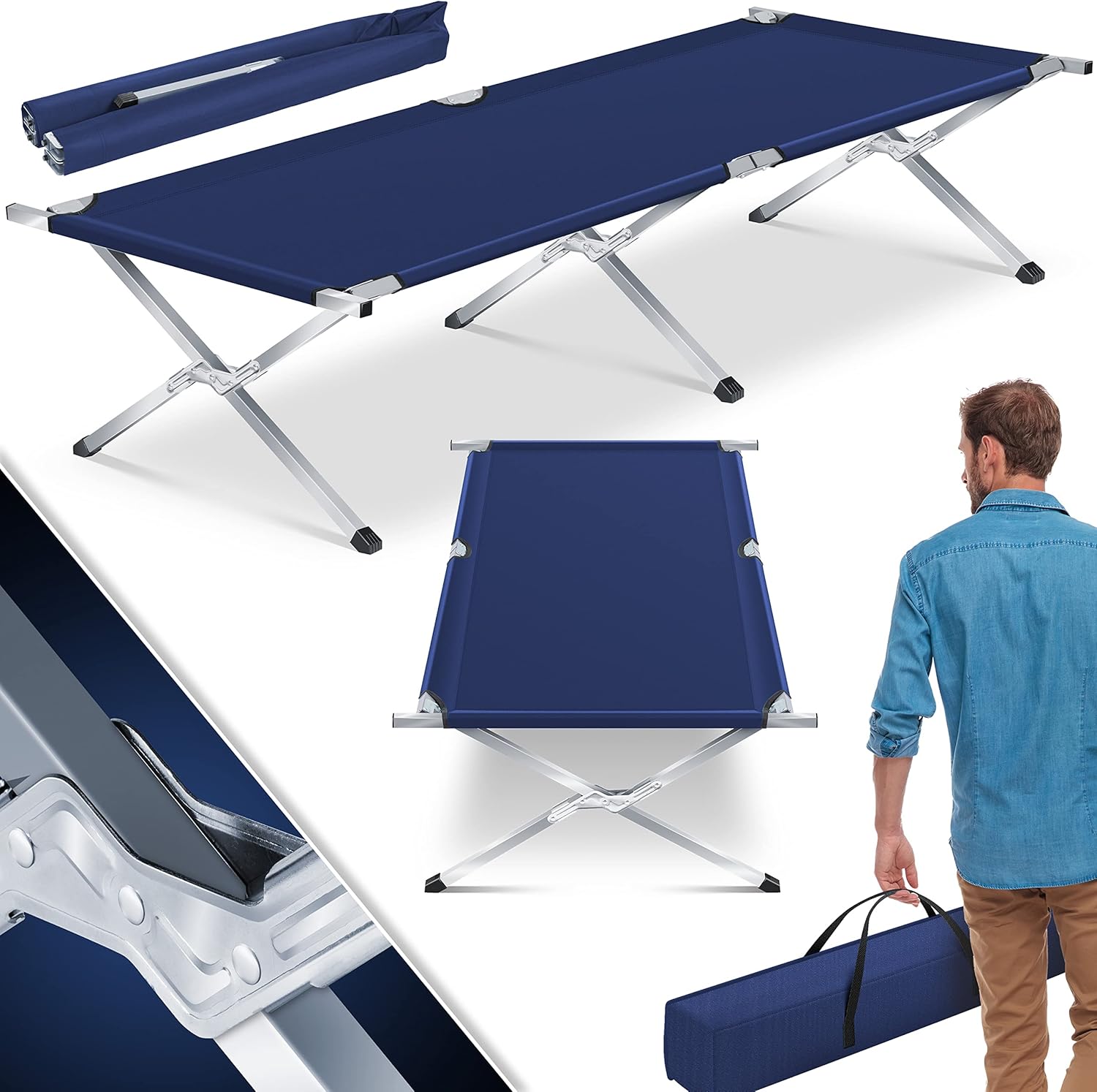 Lit de camping - Montage et démontage rapides grâce au système de pliage intelligent - Construction robuste et durable grâce à la construction en métal de qualité supérieure - Toile en tissu Oxford facile d'entretien et antidérapante - Grande capacité de charge et stabilité grâce aux tubes métalliques renforcés et aux picots en plastique antidérapants.