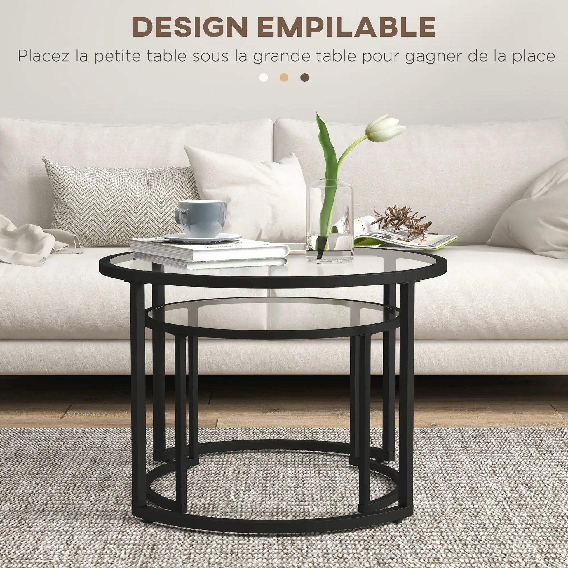 Lot de 2 Tables Basses gigognes Rondes 70/54 cm Plateau Verre trempé et Pied en Acier au Carbone Design Moderne Noir