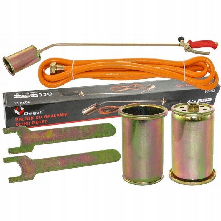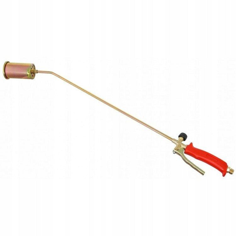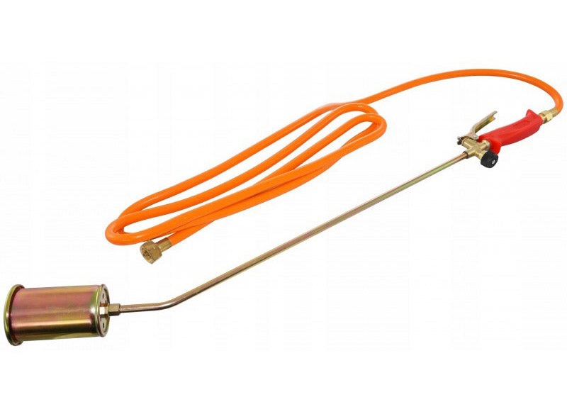 Un chalumeau de toiture long conçu pour les travaux de toiture courants. Il comprend une poignée avec levier de soupape à économie d'énergie, un tuyau avec raccords pour bouteille de 11 kg et poignée, ainsi qu'une buse. Ces chalumeaux à gaz sont conçus pour le chauffage, le séchage et les travaux de toiture. Alimentés par une bouteille de butane comprimé, ils peuvent être utilisés dans les zones sans alimentation électrique.