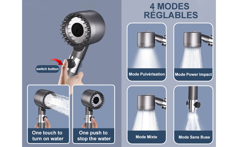 Technologie de pression innovante Notre pommeau de douche haute pression utilise une technologie pneumatique brevetée permettant d'augmenter significativement la densité et la puissance du jet d'eau. Profitez d'une couverture complète et d'une sensation de pluie intense, dépassant largement les performances des modèles traditionnels.